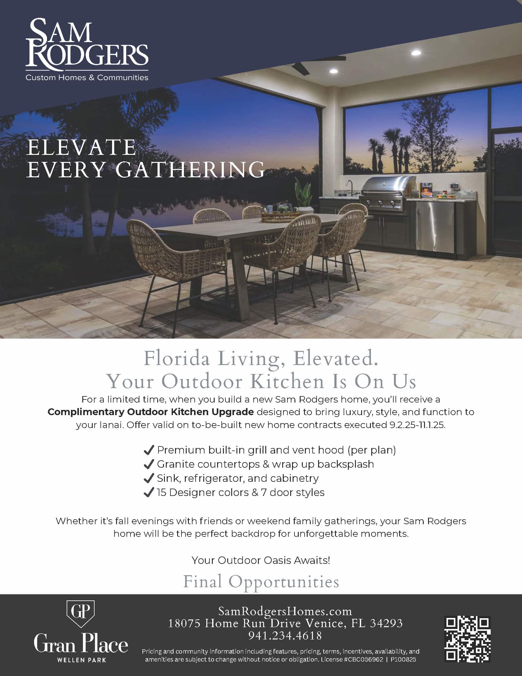 For a limited time, when you build a new Sam Rodgers homeyou’ll receive a complimentary Outdoor Kitchen Upgrade designed to bring luxury, style, and function to your lanai. Click below for promotion details!