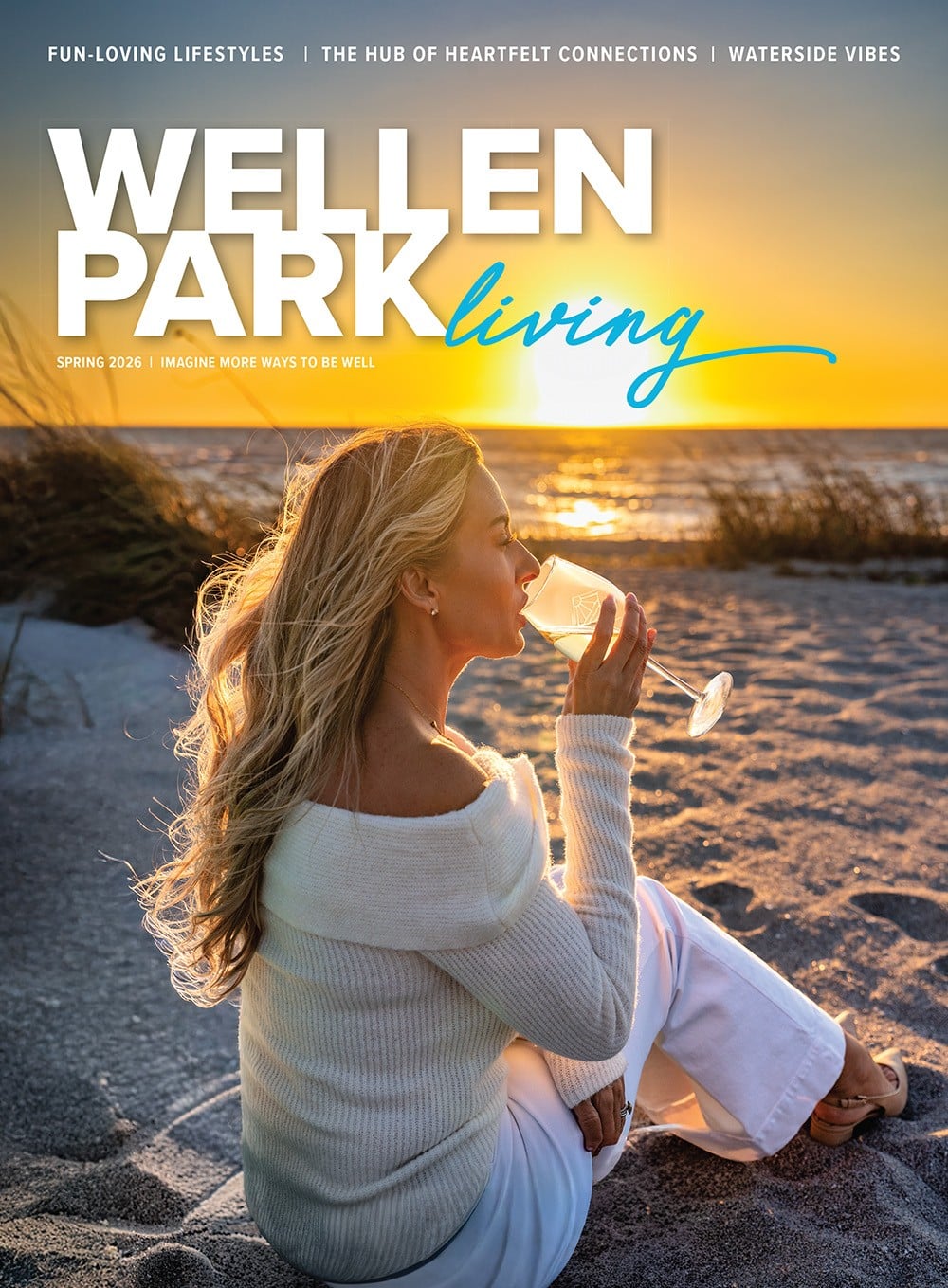 Cover of Wellen Park Living magazine showing a family walking on a boardwalk at sunset