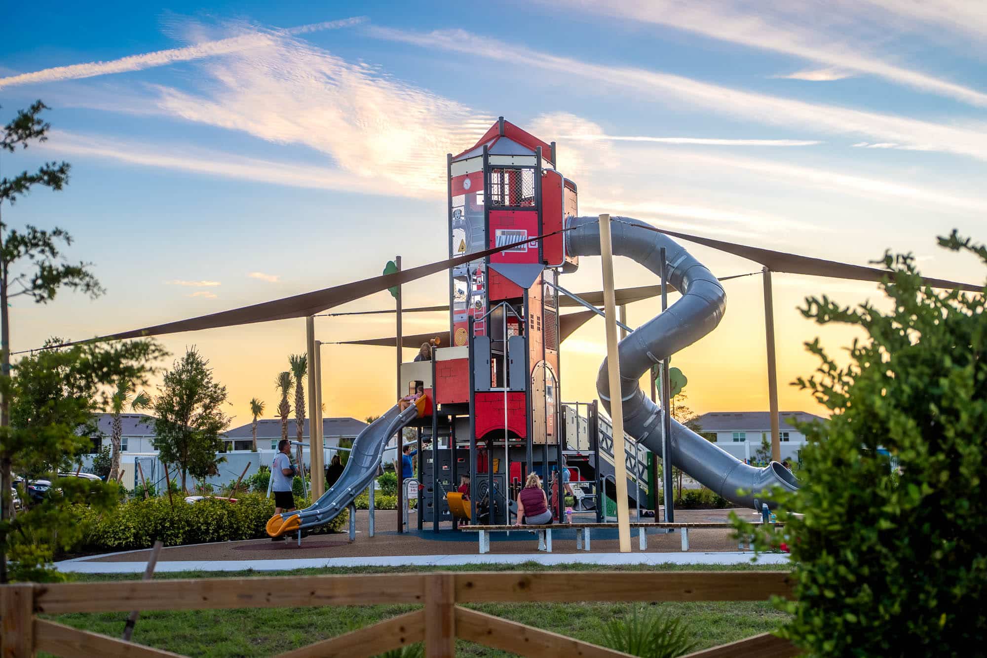 A new community playground near Manasota Beach Road featuring fire station-themed equipment, offering a vibrant play space for families and children.